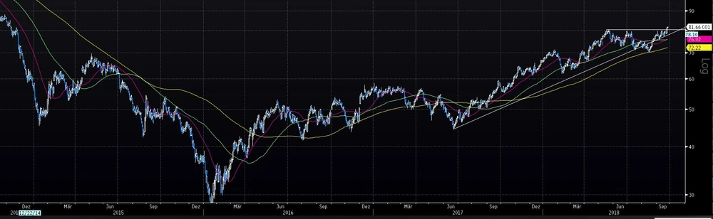 Es ist geschafft: Brent-Öl ist gestern auf über 81 Dollar geklettert und hat damit ein neues 3-Jahreshoch sowie ein neues Kaufsignal generiert. Dies dürfte den Anteilen der Energieriesen BP, Shell und Total weiteren Rückenwind bescheren, wobei es mit Total heute zunächst bergab geht – aus gutem Grund.
