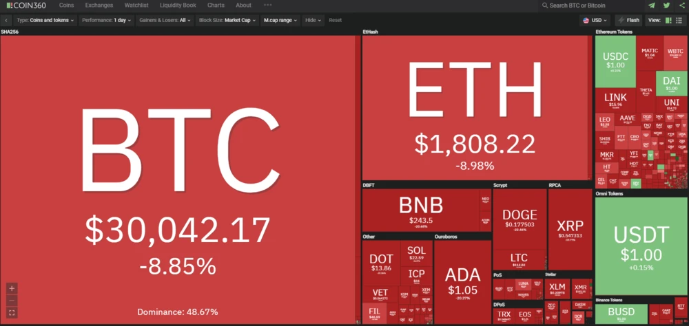 Bei zahlreichen großen Altcoins ist die Lage am Dienstag noch wesentlich dramatischer. In den Top 10 nach Market Cap crashen Binance Coin, Cardano, XRP, Dogecoin und Polkadot sogar jeweils um rund 20 Prozent. Der Gesamtmarkt verliert auf 24-Stunden-Sicht rund elf Prozent. Leichte Gewinne können in diesem Umfeld nur Stablecoins wie Tether, USD Coin, Binance USD und Dai verzeichnen.