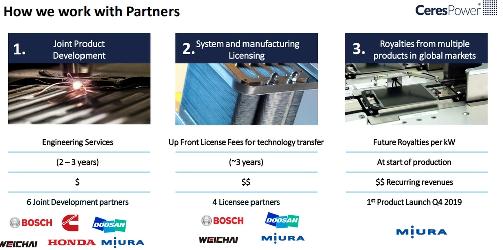 Doch was ist das Besondere an der Ceres-Power-Technologie? „Die Kernkompetenz von Ceres besteht in der Entwicklung von Zellen- und Stack-Technologie. Ceres stellt bereits kleine Mengen an Beispielanwendungen her, die ihre Kunden in den ersten stationären und mobilen Anwendungsbereichen einsetzen“, erklärt Jürgen Gerhardt, Leiter des Produktbereichs für mobile Brennstoffzellen von Bosch, gegenüber DER AKTIONÄR im Mai.