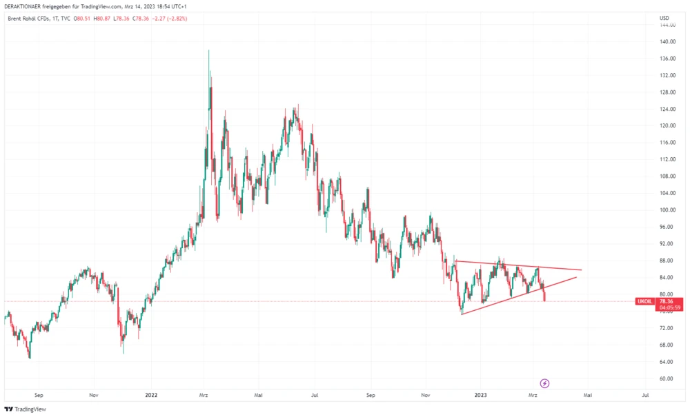 Der Preis für ein Barrel Brent-Öl purzelt weiter nach unten. Rezessionsgefahr und die US-Bankenkrise ziehen die Ölpreise in den Keller. Auch aus charttechnischer Sicht verschärft sich die Situation. So löste das Öl eine Dreiecksformation nach unten auf und generierte damit ein Verkaufssignal.