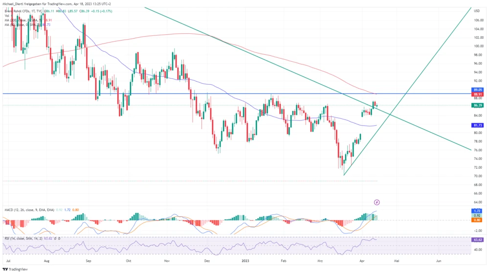 Auch das Chartbild spricht dafür, dass die Preise weiter steigen werden. Denn Öl der Sorte Brent ist aus seinem einjährigen Abwärtstrend ausgebrochen. Dass der Kurs infolge eines Ausbruchs zunächst konsolidiert, ist typisch. Nun stehen der GD200 bei 88,91 Dollar und das Jahreshoch bei 89,05 Dollar im Fokus. Springt der Preis über diesen doppelten Widerstand, sind durch das entstehende Kaufsignal dreistellige Preise möglich.
