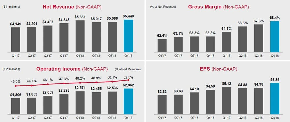 Broadcom veröffentlichte am Donnerstag Ergebnisse für das vierte Quartal, die über den Erwartungen der Analysten lagen. Der Konzern lieferte einen Umsatzzuwachs von zwölf Prozent gegenüber dem Vorjahresquartal auf 5,45 Milliarden Dollar. Die Gewinne je Aktie lagen mit 5,58 Dollar je Aktie dabei über den Erwartungen der Analysten von 5,39 Dollar.