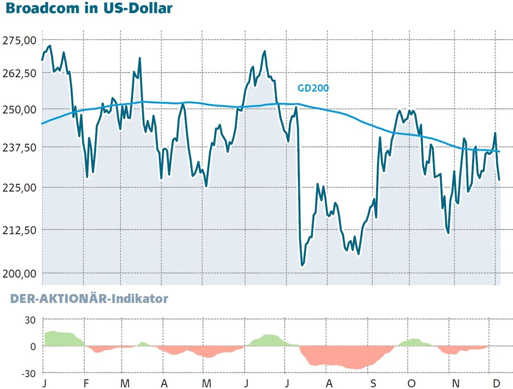 Anleger von Halbleiter-Aktien haben im rauen Marktumfeld die Chance aufzuatmen. Denn der Chip-Hersteller Broadcom überzeugte im vierten Quartal Anleger und Analysten. Zudem gab der Apple-Zulieferer einen überraschend starken Ausblick fürs nächste Geschäftsjahr aus. Die Aktie legte nachbörslich um fünf Prozent zu.