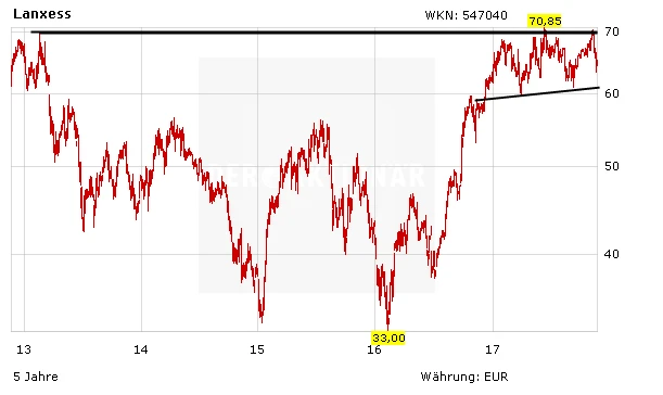 Anleger können es Buffett dennoch gleichtun und bei Lanxess einsteigen. Zumal die Aktie bald kräftig Fahrt aufnehmen könnte: Nachdem der Kurs bisher immer wieder am Widerstandsbereich um das Allzeithoch bei 70,85 Euro gescheitert ist, dürfte es nun zu einem weiteren Ausbruchsversuch kommen. Durch den Sprung über diese Hürde würde die Lanxess-Aktie ein starkes Kaufsignal generieren.