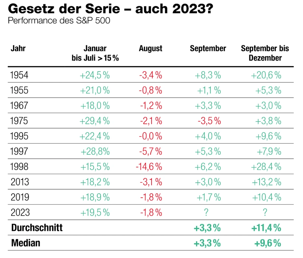 Im Fall des S&P 500 gibt es noch eine weitere Statistik, die Mut macht: Der Index hat von Januar bis Juli 2023 19,5 Prozent zugelegt. Nach Ende des Zweiten Weltkriegs kam es laut Carson nun zehnmal vor, dass der S&P 500 in besagtem Zeitraum um mehr als 15 Prozent gestiegen ist. Jedes Mal war der August negativ. Bis auf eine Ausnahme (1975) gab es im September dann wieder Gewinne.