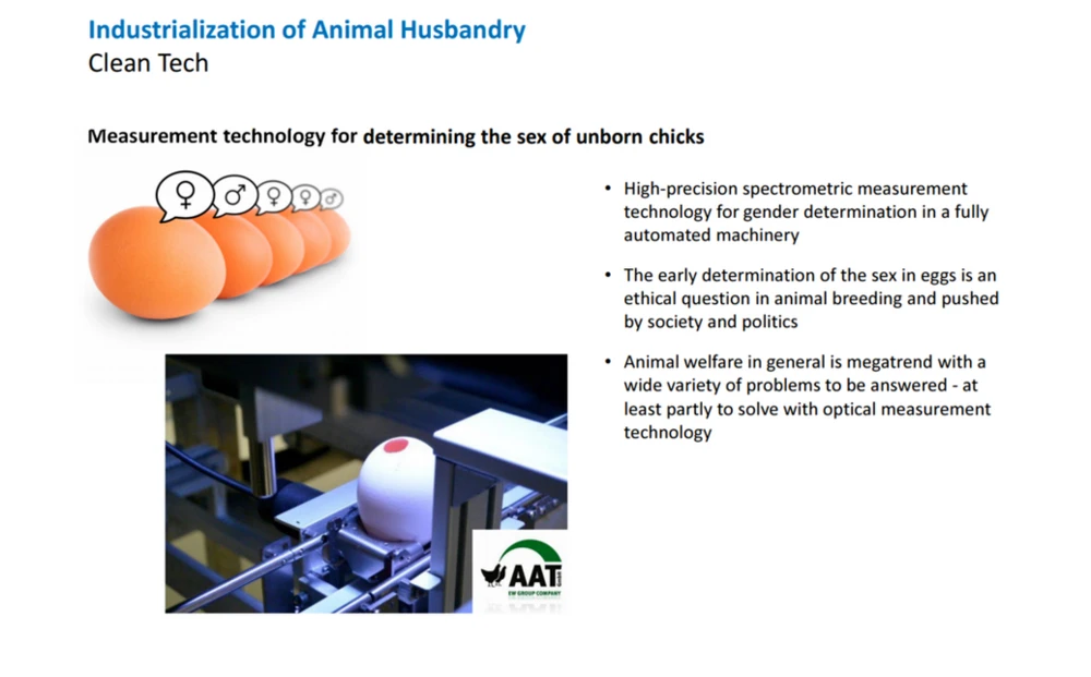 Als Spezialist für berührungslose Messtechnik hat Nynomic eine entsprechende Lösung im Programm: Eine vollautomatische spektroskopiebasierte Lösung zur Bestimmung des Geschlechts von Hühnerküken zu einem sehr frühen Zeitpunkt bereits im Ei. "Damit adressiert Nynomic ein innovatives Anwendungsfeld, das nicht zuletzt durch den jüngst vorgestellten Gesetzentwurf zum Verbot des 'Kükentötens' in Deutschland ab Ende 2021 eine ausgeprägte rechtliche ebenso wie industrielle Relevanz aufweist”, heißt es bei Montega Research. “Das Erlöspotenzial für Nynomic könnte perspektivisch im deutlich siebenstelligen Bereich liegen.”