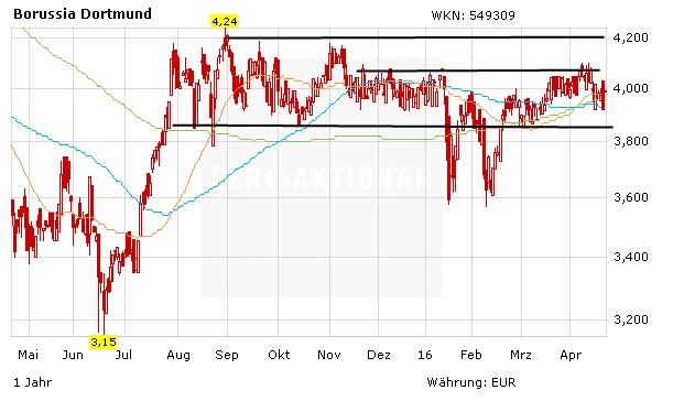 Es bleibt dabei: Der BVB spielt eine erstklassige Saison. Nach dem Ausscheiden aus der Europa League ist die Aktie zwischenzeitlich unter Druck geraten. Potenzial ergibt sich wieder, wenn die Widerstandszone zwischen 4,10 Euro und 4,20 Euro überwunden wird. Die Aktie ist nicht nur für Fußball-Liebhaber eine interessante Depotbeimischung. Kursziel 5,00 Euro.