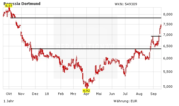 Fußballaktien sind natürlich alles andere als Witwen- und Waisenpapiere. Mutige Anleger können angesichts des guten Chance-Risiko-Verhältnisses bei den im Branchenvergleich günstig bewerteten BVB-Anteilen weiterhin zugreifen. Der Stopp sollte bei 5,65 Euro belassen werden.