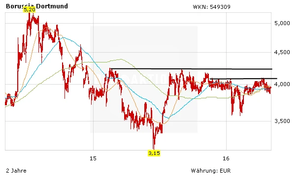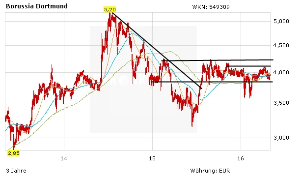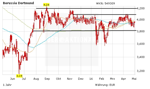 Nach dem Ausscheiden aus der Europa League und den Abschiedsgerüchten von Kapitän Mats Hummels ist die BVB-Aktie kurzfristig unter Druck geraten. Bei 3,82 Euro hat sich das Papier wieder gefangen. Die Aktie ist nicht nur für Fußball-Liebhaber eine interessante Depotbeimischung. Allerdings sollten Anleger abwarten, bis die hartnäckige Widerstandszone zwischen 4,10 Euro und 4,20 Euro überwunden wird. Hierin bewegt sich die Aktie nunmehr seit bereits neun Monaten. Kursziel 5,00 Euro.