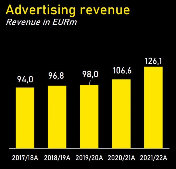 Die Zuschauereinnahmen und die TV-Erträge dürften sich relativ stabil entwickeln. Konstante Wachstumsraten verbuchte der BVB indes in den vergangenen Jahren regelmäßig bei der Werbung. So konnte der BVB den Ende August vorgelegten vorläufigen Zahlen zufolge im vergangenen Geschäftsjahr dank Werbepartnern wie 1&1, Evonik oder Puma 142 Millionen Euro verdienen. In der Saison 2021/22 beliefen sich die Einnahmen in diesem Bereich noch auf 126 Millionen Euro. Zum Vergleich: Im Fiskaljahr 2017/18 kam man hier lediglich auf 94 Millionen Euro. Dies kann durchaus als Beleg gelten, dass Borussia Dortmund offenbar für Werbepartner immer attraktiver wird.