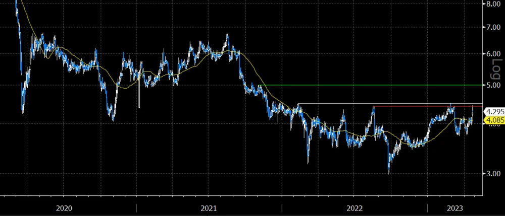 Die letzten fünf Spieltage könnten also nach Jahren der gähnenden Langeweile im Titelkampf wieder interessant werden (lediglich in der Saison 2018/19 wurde die Meisterschaft erst am letzten Spieltag entschieden, ansonsten war Bayer München immer deutlich früher der Titel sicher). Und auch aus charttechnischer Sicht lohnt es sich durchaus, einen genaueren Blick auf den BVB zu werfen. Denn die Aktie notiert nun knapp unter dem Widerstandsbereich zwischen 4,40 und 4,50 Euro. Sollte diese Hürden gemeistert werden, wäre anschließend der Weg frei bis zur Marke von 5,00 Euro. Sollte auch dieser Widerstand bezwungen werden, hätte der Kurs sogar Luft bis in den Bereich um 6,00 Euro.