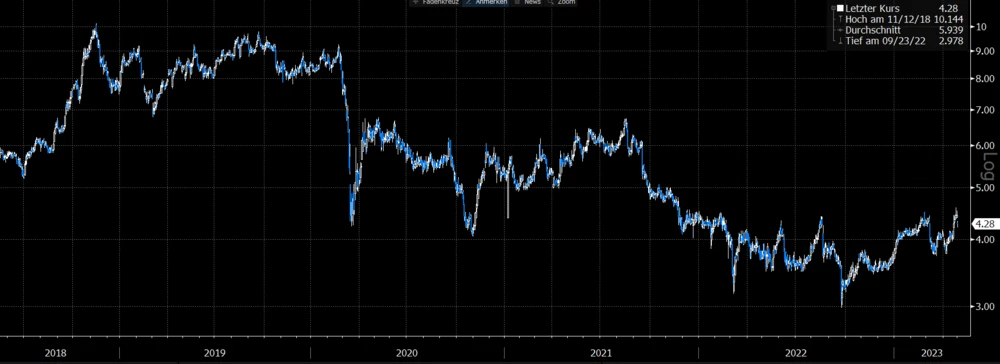 Die BVB-Aktie könnte es im Zuge der jüngsten Ergebnisse vom Wochenende im heutigen Handel wieder etwas schwerer haben. An den grundsätzlich guten Perspektiven für den Verein ändert sich aber nicht allzu viel. Borussia Dortmund hat sehr gute Chancen, wieder nachhaltig schwarze Zahlen zu schreiben, was im Kurs aber immer noch nicht eingepreist sein dürfte. Mutige mit einem langen Atem können daher nach wie vor auf eine nachhaltige Erholungsbewegung der Aktie setzen. Der Stoppkurs kann bei 3,10 Euro belassen werden.