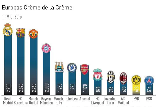 Vor Kurzem hat das US-Wirtschaftsmagazin Forbes die Fußballklubs rund um den Globus auf Herz und Nieren geprüft. Berechnungsgrundlage waren unter anderem Umsatz, operatives Ergebnis und Schuldenstand der Klubs. Spitzenreiter ist Real Madrid mit 2,90 Milliarden Euro. Der BVB landet in der Rangliste auf Platz 11. Wert: 623 Millionen Euro. Der FC Bayern landet mit einer Bewertung von 2,09 Milliarden Euro auf Platz 4 (siehe Grafik). „Die Bayern haben in den letzten Jahren sicherlich viel richtig gemacht. Sie haben viele große, namhafte Sponsoren gewonnen. Der BVB hat hier sicherlich noch Potenzial. Grundsätzlich sollte meiner Meinung nach die Lücke zwischen dem FC Bayern und Borussia Dortmund bezüglich des Marktwerts kleiner sein“, sagt Schlienkamp. Analyst Schlienkamp jedenfalls sieht auf dem aktuellen Niveau eine schöne Kaufgelegenheit. „Das Kursziel von 5,00 Euro wird derzeit durch den Wert des aktuellen Kaders abgedeckt. Die Marke BVB bekommt der Anleger derzeit umsonst mit dazu“, so der Experte. Ein Katalysator wäre zum Beispiel der Gewinn des DFB-Pokals in der laufenden Saison oder die Qualifikation für die Champions League 2016/17.