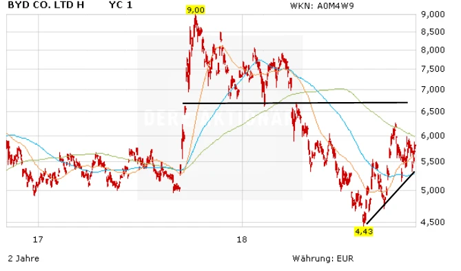 Die Nachfrage nach Batterien sollte in den nächsten Jahren durch die Decke gehen. Wenige Anbieter wie Panasonic, CATL, Samsung SDI und BYD dürften die Marktanteile unter sich aufteilen und dicke Gewinne einfahren. Es bleibt dabei: Die BYD-Aktie bleibt spannend, Anleger warten auf den Ausbruch über die wichtige 200-Tage-Linie. Im Anschluss wäre der Weg bis zum horizontalen Widerstand bei 6,60 Euro frei. Stoppkurs 4,65 Euro!