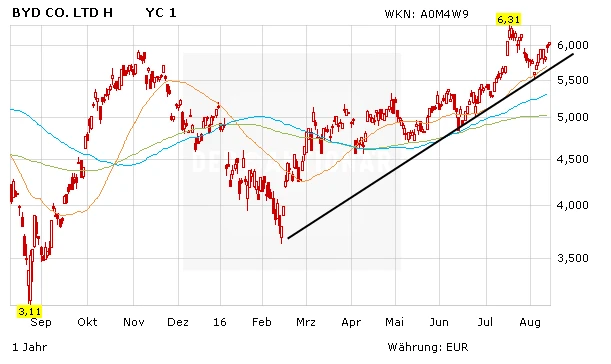 Nicht nur deshalb hat die Aktie von BYD nach wie vor sehr gute Chancen. Vor wenigen Tagen hat das Papier wieder nach oben gedreht. Die 6,00 Euro-Marke wurde wieder zurück erobert. Nächstes Ziel ist das Allzeithoch aus dem Monat Juni im Jahr 2015 bei umgerechnet 7,16 Euro.