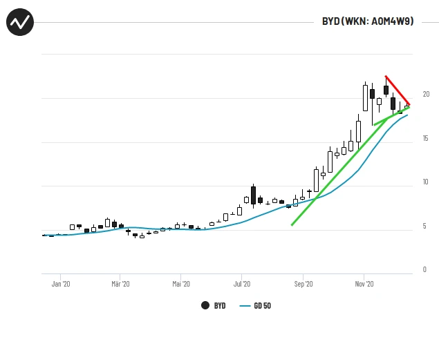 Es bleibt dabei. Die BYD-Aktie konsolidiert auf hohem Niveau. Dabei hat sich die untere Begrenzung bei 18,00 Euro mehrmals als Support herausgestellt. Die 50-Tage-Linie verläuft aktuell bei 18,08 Euro und dient ebenfalls als Unterstützung. Gelingt es der Aktie in den nächsten Tagen die obere Begrenzungslinie des ansteigenden Dreiecks bei rund 19,95 Euro zu überwinden, wäre der Weg Richtung Allzeithoch bei 22,40 Euro frei.