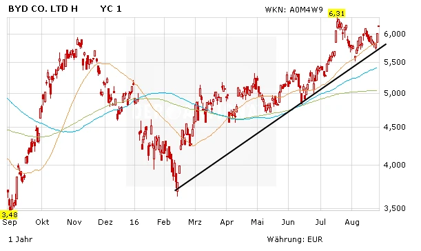 Die Zahlen für das zweite Quartal waren in Ordnung. Die BYD-Aktie nimmt die Steilvorlage auf und klettert auf ein neues Jahreshoch. Die guten Zahlen kommen nicht von ungefähr. BYD erreicht mit seinen Elektroautos auf einen Marktanteil in China von 30 Prozent. Drei der vier meistverkauften Stromer im Monat Juli kommen aus dem Hause BYD.