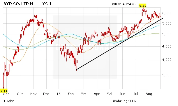 BYD wird voraussichtlich am 26. August Zahlen für das zweite Quartal vorlegen. Es bleibt dabei: Gibt es Rücksetzer bei der Aktie, sollten Anleger diese Kurse nutzen um eine Position auf- beziehungsweise die bestehende auszubauen.Der Aufwärtstrend ist intakt. BYD ist eine spannende, wenn auch spekulative Wette auf den Ausbau der Elektromobilität. DER AKTIONÄR geht davon aus, dass BYD vor allem im Heimatmarkt China in Zukunft eine gute Rolle spielen wird. Bis zum Allzeithoch von 8,05 Euro, erreicht im April 2010, hat die Aktie noch Potenzial.