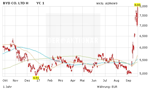 Zuletzt setzte bei BYD eine Konsolidierung ein. Von knapp unter 8,00 Euro ging es auf 7,00 Euro abwärts. Sofort setzte wieder Kaufinteresse ein. Hinzu kam einen neue Kaufempfehlung von JP Morgan. Analyst Nick Lai begründet den Schritt mit dem „gewaltigen Potenzial“ für BYD durch die zu erwartenden Anpassungen der chinesischen Umweltpolitik. Das Kursziel hob er von 68 auf 100 HongKong-Dollar an. BYD könnte zudem mit seinen neuen Modellen positiv überraschen, so Analyst Lai. „BYD ist ein sehr interessantes Unternehmen. Die Positionierung ist gut und die Zukunftsaussichten sehen vielversprechend aus. Insbesondere der wichtige chinesische Markt dürfte von einem Unternehmen wie BYD besser abgedeckt werden als von einem ausländischen Vertreter“, sagt Asienexperte Andreas Lipkow.