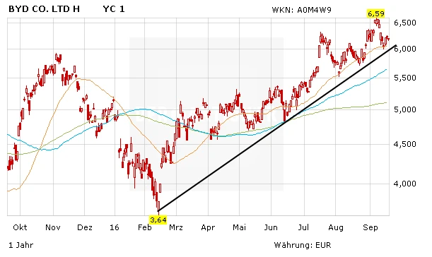Die Aktie befindet sich nach einer kurzen Korrektur bis auf umgerechnet 5,85 Euro schon wieder im Aufwärtstrend und notiert aktuell bei 6,18 Euro. Es bleibt dabei: Nächstes Etappenziel ist das Allzeithoch von umgerechnet 8,05 Euro aus dem Jahr 2009. BYD ist aktuell mit Tesla zusammen die heißeste Wette auf einen zügigen Ausbau der Elektromobilität.