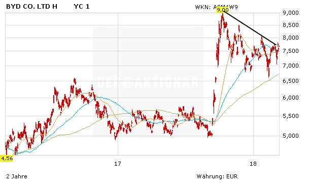 Die Aktie von BYD kommt nicht richtig vom Fleck. Dabei bleiben die Rahmendaten gut. Die zuletzt gemeldeten Zahlen waren im Rahmen der Erwartungen: Der Umsatz kletterte im Vergleich zum Vorjahr um 2,3 Prozent auf umgerechnet 16,7 Milliarden Euro. Der Nettogewinn ist um knapp 20 Prozent auf 640 Millionen Euro zurückgegangen.