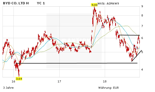 Die BYD-Aktie bleibt spannend. Wird die Marke von 6,00 Euro genommen, ist der Weg bis zum nächsten Widerstand bei 6,50 Euro frei. Unterstützung nach unten bietet die Linie bei 5,50 Euro. Hier verläuft auch die 38-Tage-Linie. Stoppkurs 4,65 Euro!