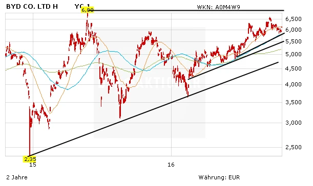 Nach einer ausgeprägten Konsolidierung nimmt die Aktie von BYD wieder Fahrt auf. Exakt an der 90-Tage-Linie hat das Papier gedreht. Gelingt in den nächsten Wochen erneut der Sprung über die Marke von 6,50 Euro, lautet das nächste Etappenziel das Allzeithoch 8,05 Euro aus dem Jahr 2009.