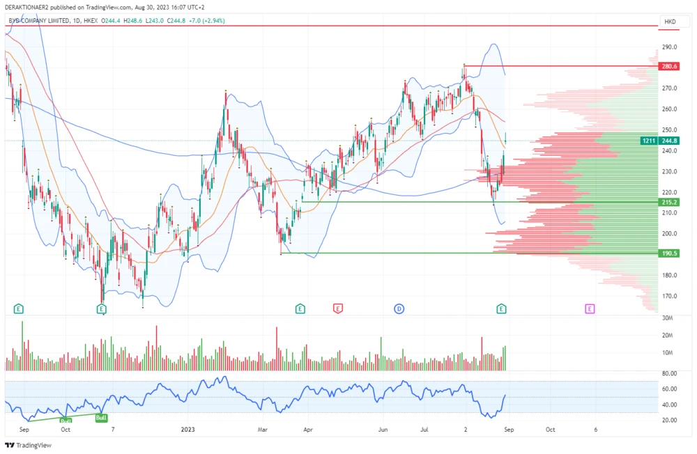 Vom Mehrmonatshoch bei 280,60 Hongkong-Dollar (HKD) Anfang August ging es für die BYD-Aktie nach starken Monaten zunächst bergab. In der vergangenen Woche meisterten die Bullen die Stabilisierung bei der Unterstützung bei 215,20 HKD. Dank des positiven Newsflows lockte dieses Level Schnäppchenjäger auf den Plan.