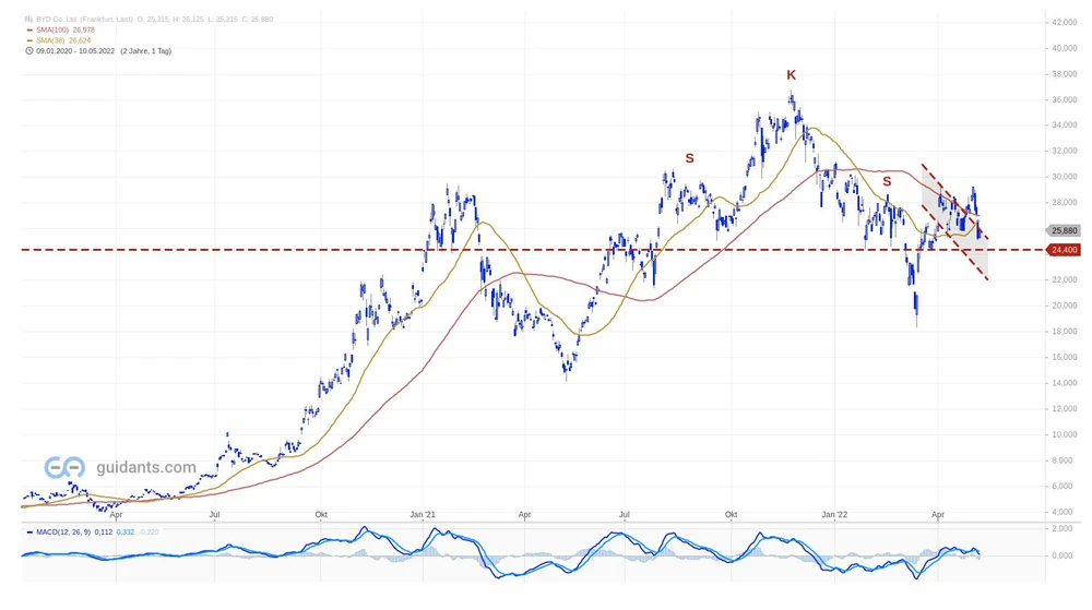 Vor kurzem erklärte BYD seinen Ausstieg aus der Verbrenner-Produktion. Nicht 2025 oder 2030, sondern sofort. Das Jahresziel von 1,5 Millionen verkauften NEVs im Jahr 2022 ist machbar. Die Produktpipeline macht Lust auf mehr. Charttechnisch stand die Aktie jedoch etwas unter Druck. Am Mittwoch macht das Papier jedoch einen gewaltigen Satz nach oben!