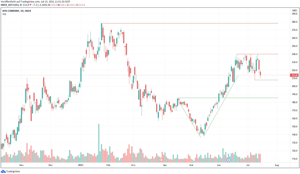 Die BYD-Aktie hat erneut mit Rücksetzern zu kämpfen. Wichtig ist nun, dass die oben genannte Marke verteidigt wird. Mit einer Fortsetzung der Erholungsbewegung kann erst bei Kursen über 240 HKD gerechnet werden.