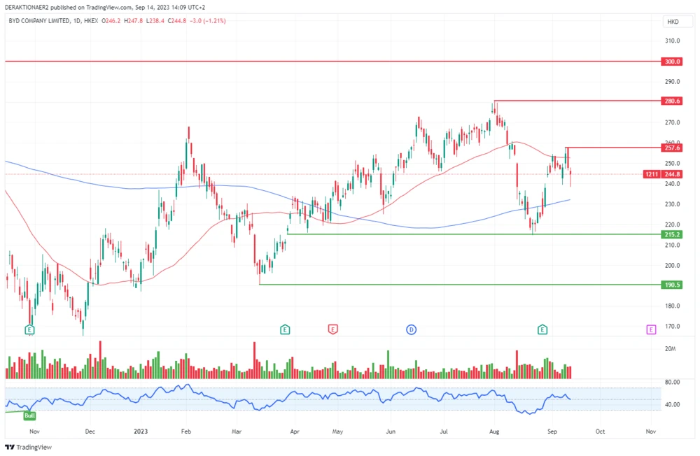 Vom Mehrmonatshoch bei 280,60 Hongkong-Dollar (HKD) Anfang August ging es für die BYD-Aktie nach starken Monaten zunächst bergab. In der vergangenen Woche meisterten die Bullen die Stabilisierung bei der Unterstützung bei 215,20 HKD. Dank des positiven Newsflows lockte dieses Level Schnäppchenjäger auf den Plan.