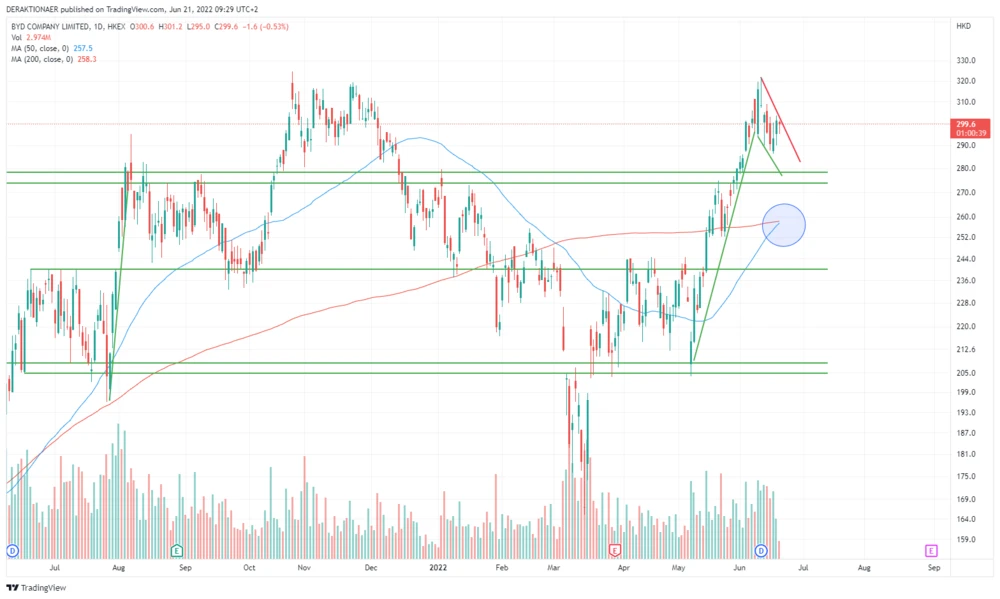 Die BYD-Aktie hat sich im zuletzt volatilen Marktumfeld hervorragend entwickelt. Neues Potenzial ergibt sich, sobald das Papier die Flaggen-Formation und das bisherige Allzeithoch bei 324,60 HKD nimmt. Anleger bleiben investiert.