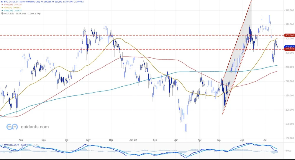 „Aktuell notiert das Papier von BYD bei rund 288 Hongkong-Dollar (HKD). Bei 305 HKD verläuft nun die nächste Widerstands-Linie. Diese ehemalige Support-Marke wurde durch das Gap vom 11. Juli deutlich unterschritten. Die 200-Tage-Linie wurde allerdings im Anschluss daran nicht angelaufen. Dieser Test blieb bis dato aus. Die mittelfristige Markttechnik ist aktuell neutral. Auch die kurzfristige Slow-Stochastik bläst in dieses Horn. Das 14-Tage-Momentum zeigt sich allerdings negativ. Es bleibt dabei: Für risikoaverse bietet sich aus aktueller charttechnischer Sicht ein ganz enger Stopp bei 274 HKD an. Sollten die 285 HKD durchbrochen werden, verläuft dort die nächste Auffanglinie. Das aktuelle – kurzfristige – Chance-Risiko-Verhältnis im Falle eines erfolgreichen Tests der 285 HKD beträgt nach oben hin 305 HKD“, sagt Charttechnik-Spezialist Martin Utschneider von Donner & Reuschel,