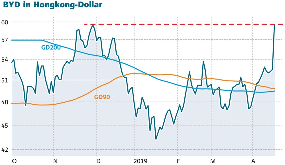 Mit dem Kurssprung heute hat BYD die psychologisch wichtige Marke von 54 Hongkong-Dollar oder umgerechnet 6,15 Euro hinter sich gelassen. Zeitweise notierte die Aktie schon über dem Widerstand bei 58,17 Hongkong-Dollar (6,56 Euro).