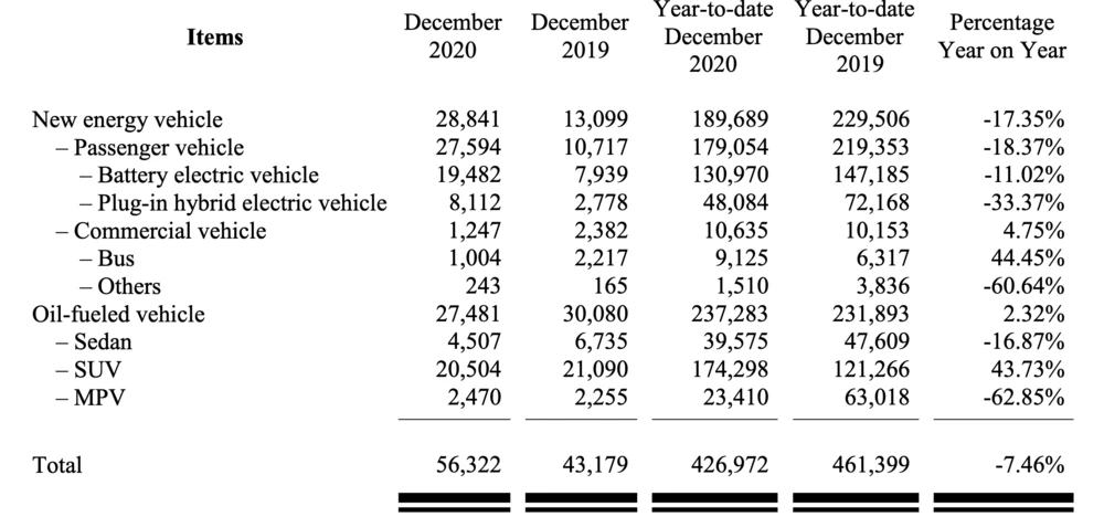 Wenngleich auch bei Elektromobilen ein Rückgang vermeldet wurde, fiel dieser mit elf Prozent vergleichsweise moderat aus. Und: Im Dezember lag die Zahl der Auslieferungen mit 19.482 Einheiten deutlich höher als ein Jahr zuvor, als 7.939 Fahrzeuge verkauft wurden.