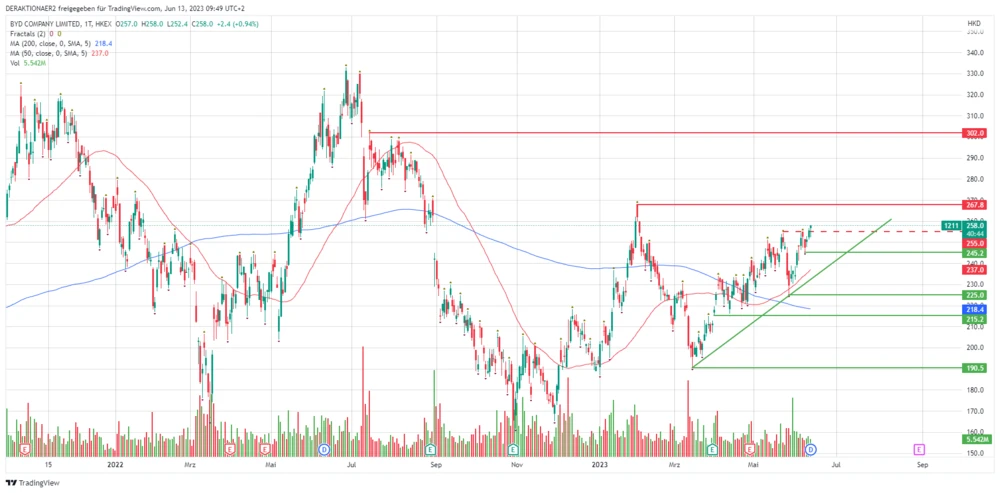 Die BYD-Aktie klettert weiter Richtung Norden und mit dem Ausbruch über den Widerstand bei der 255-HKD-Marke hat der Titel nun ein weiteres technisches Kaufsignal ausgelöst. Damit nehmen die Bullen nun bereits die nächste Hürde ins Visier. Bei 267,90 HKD befindet sich am Jahreshoch ein wichtiges Level. Aufgrund der Trendstärke und der Dynamik stehen die Chancen gut, dass die Bullen in den kommenden Wochen auch diese Marke erreichen.