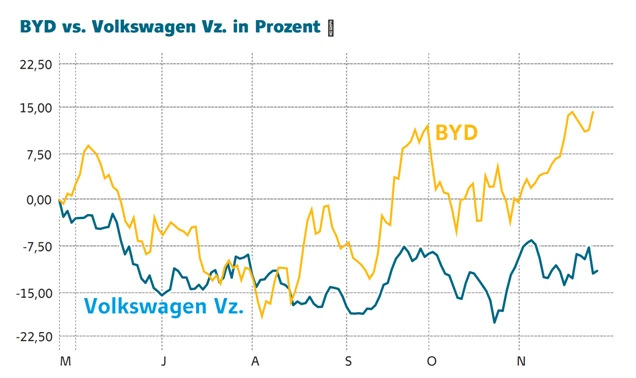 In den letzten Wochen stach BYD mit Relativer Stärke gegenüber vielen anderen Papieren aus dem Reich der Mitte hervor. Auch im Vergleich zu VW, BMW und Co schneidet das Papier weitaus besser ab.