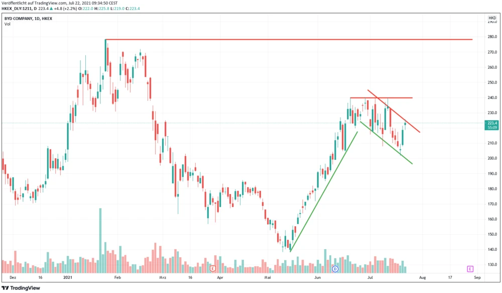 Nach der 75-prozentigen Aufwärtsrallye zwischen Mitte Mai und Mitte Juni ist der BYD-Aktie erstmal die Luft ausgegangen. Der Wert war stark überhitzt und auch der Sprung über die Hürde bei 240 Hongkong-Dollar (HKD) scheiterte mehrfach. Inzwischen ist erkennbar, dass sich der Kurs innerhalb eines Kanals nach unten bewegt.