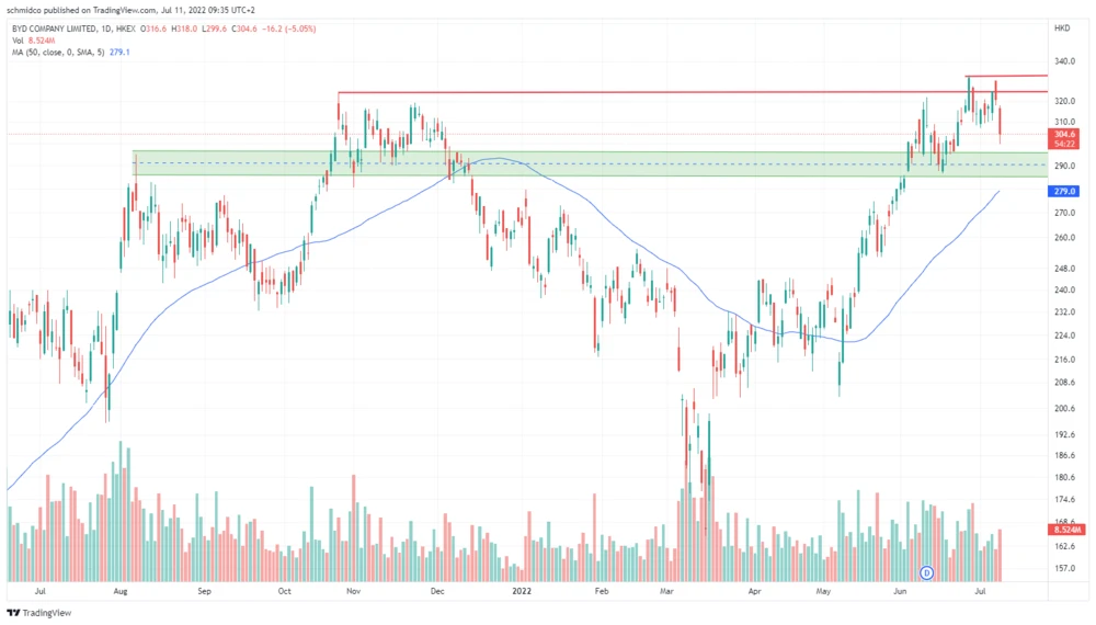 Kurzfristige Rücksetzer bei der BYD-Aktie sind kein Beinbruch, zumal da die Supportzone sehr mächtig ist. Langfristig steckt in der Aktie großes Potential, wie auch das neue Analystenrating zeigt. Anleger bleiben dabei.