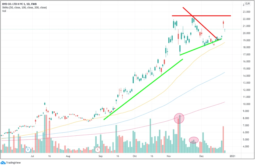 DER AKTIONÄR berichtete bereits über die bullishe Wimpel-Formation, die die BYD-Aktie seit August ausgebildet hatte. Mit einem kräftigen Kurssprung durchbrach der Wert am Montag die obere Begrenzungslinie des Wimpels bei rund 19,20 Euro und legte daraufhin in der Spitze um rund zwölf Prozent zu.