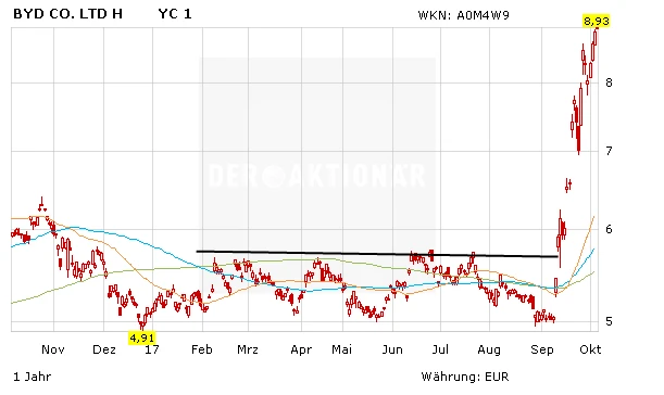 BYD fädelt einen Deal nach dem anderen ein, die Aktie eilt angetrieben von einem überaus guten Newsflow von einem Hoch zum Nächsten. Build Your Dreams hat mit seinem Joint Venture Partner Alexander Dennis Limited (ADL) zwölf Elektrobusse in die Stadt Liverpool nach Großbritannien ausgeliefert. Auftraggeber für die Busse ist die Liverpool City Region Bus Alliance.