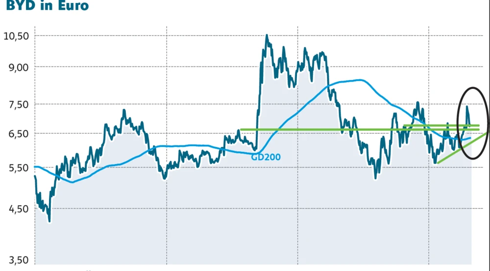 Die BYD-Aktie hat nach dem Zwischenspurt wieder auf 53,10 Hongkong-Dollar oder umgerechnet 6,05 Euro korrigiert. Der Bereich zwischen 56,14 Hongkong-Dollar (umgerechnet 6,34 Euro) und 54,20 Hongkong-Dollar (6,12 Euro) hat nicht als Unterstützung dienen können.