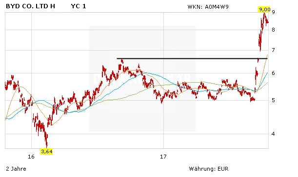 Es bleibt bei folgender Rechnung: 2030 könnte China auf eine Elektroautoquote von 100 Prozent kommen. Soll heißen: 40 Millionen neue Elektroautos. Kann BYD auf einen Marktanteil von 15 oder 20 Prozent stemmen, würde das vier oder gar acht Millionen E-Autos bedeuten. Zum Vergleich: BYD hat 2016 100.000 Elektroautos verkauft. Hinzu kommt: BYD baut das wichtigste Assett im E-Mobility-Bereich selber: die Batterien. 2016 war man hinter Tesla/Panasonic auf Platz zwei. Und BYD hat bereits angekündigt, die Produktion verdreifachen zu wollen.