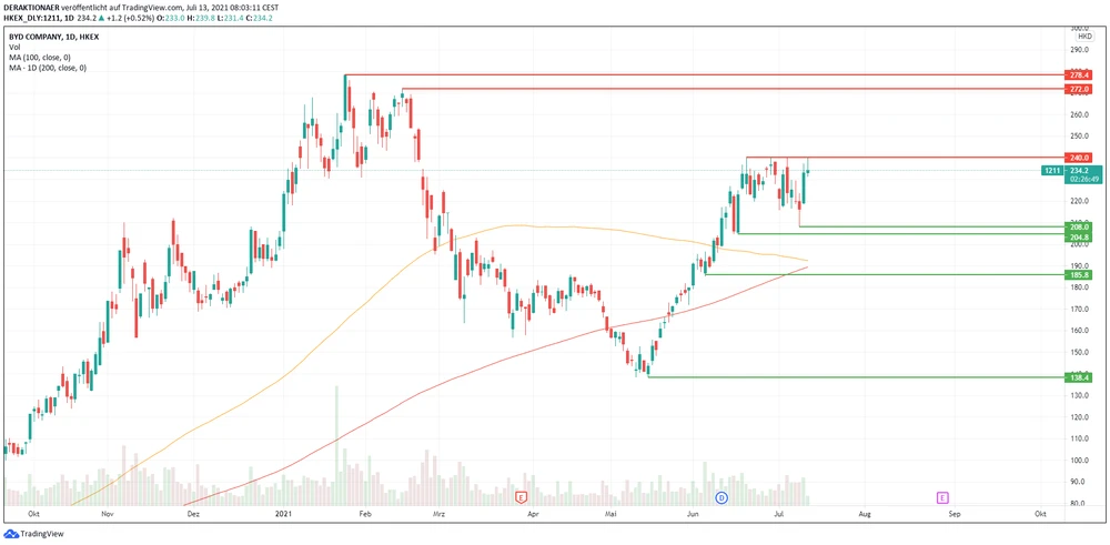 Die Anteilsscheine von BYD hatten zunächst einen enttäuschenden Jahresstart. Der Preis für eine Aktie halbierte sich und Mitte Mai markierte der Wert ein Mehrmonatstief bei 138 Hongkong-Dollar (HKD). Von diesem Punkt aus startete der Titel einen kraftvollen Rebound. Ohne nennenswerte Konsolidierung stieg der Kurs um 73 Prozent und erreichte am 21. Juni ein neues Mehrmonatshoch bei 240 HKD. Im Anschluss setzten Gewinnmitnahmen ein und die Aktie verlor rund 13 Prozent.