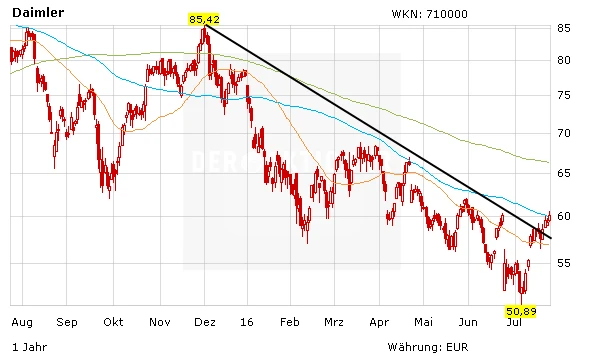 Aktuell sind es für die Daimler-Aktie minus 38,8 Prozent seit dem Hoch von 96,07 Euro im März 2015. Rund 39 Milliarden Euro an Firmenwert wurden binnen 16 Monaten vernichtet. Des Weiteren hagelte es Abstufungen der Analysten. Wenn alle zum Verkauf trommeln, könnte ein guter Zeitpunkt gekommen sein, die Aktie einzusammeln oder zumindest einen Fuß in die Tür zu stellen. Das Ende des Ausverkaufs könnte mit der Bekanntgabe der Zahlen für das zweite Quartal erfolgt sein. Bislang hat Mercedes nur die B-Klasse und den Smart Fortwo Electric Drive als Stromer im Angebot. Das wird sich bald ändern. Daimler-Vorstand und Mercedes- Vertriebschef Ola Källenius sieht derzeit durch den Wandel in der Autobranche mehr Chancen als Herausforderungen. Daimler werde den Weg zu null Emissionen konsequent weitergehen und die Chancen, die sich aus dem Wandel des Mobilitätsbedarfs ergeben, nutzen. In den nächsten fünf bis zehn Jahren werde sich in der Branche mehr verändern als in den vergangenen fünfzig Jahren. Schon im Oktober, auf dem Autosalon in Paris, will Daimler seinen Tesla-Jäger vorstellen. Voraussichtlich 2018 wird Daimler sein erstes langstreckentaugliches Elektroauto in die Verkaufsstores bringen. DER AKTIONÄR ist davon überzeugt, dass Daimler den Wandel hin zum Mobilitätskonzern der Zukunft meistern wird. Am Geld sollte es nicht liegen. 13 Milliarden Euro Gewinn vor Zinsen u n d Steuern hat der Autobauer 2015 eingefahren, viel weniger wird es auch 2016 und 2017 nicht werden. Von derartigen liquiden Mitteln kann Tesla nur träumen. In Ausgabe 27/2016 hat DER AKTIONÄR bei Daimler zwei Abstauberlimits bei 52,75 Euro sowie 50,80 Euro empfohlen. Mit dem ersten ist der Anleger zum Zug gekommen. Mittlerweile hat sich das Papier auf 58,80 Euro erholt. Entwarnung? Vorerst zumindest.