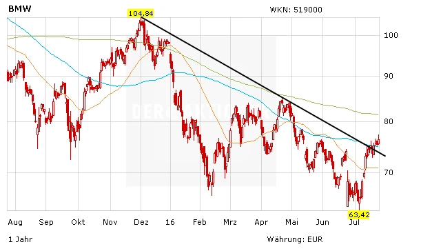 Die Aktien von Daimler und BMW stehen jetzt kurz davor, ihre Abwärtstrends zu verlassen und nach oben auszubrechen. Wer durch das Abstauberlimit aus Ausgabe 27/2016 bei Daimler zum Zug kam, bleibt investiert und sichert seine Gewinne mit einem Stopp auf Einstandsniveau ab. Auf dem aktuellen Niveau ist sowohl bei Daimler als auch bei BMW eine Anfangsposition durchaus vertretbar. Der Stoppkurs sollte zehn bis 15 Prozent unter dem Einstand gesetzt werden. Wird der Ausbruch aus den Abwärtstrends und ein neuer Aufwärtstrend etabliert, wird die Position prozyklisch ausgebaut. Auf lange Sicht sollte sich als Depotbeimischung eine Investition in Chinas Elektroautobauer BYD auszahlen. Die Firma ist sicherlich ein Exot. Das Wachstum ist jedoch sportlich und die Prognosen für die nächsten Jahre sind klasse!