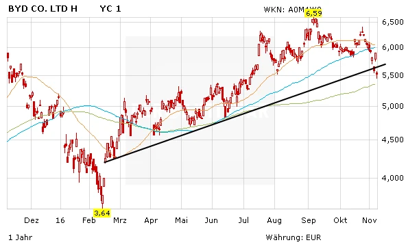 Nach einer ausgeprägten Konsolidierung hat die Aktie des chinesischen Elektroautobauers am Montag wieder Fahrt aufgenommen. Am Mittwoch fällt das Papier aufgrund des Wahlausgangs in den USA deutlich zurück. Fakt ist: BYD ist mit seinen Verkaufsschlagern Qin und Tang Marktführer bei Elektroflitzern in China und wird vom weiteren Ausbau der E-Autos profitieren. Anleger nutzen den Kursrücksetzer und stellen mit einer ersten Position einen Fuß in die Tür.