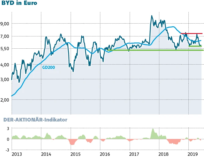 Aus technischer Sicht kann für die Aktie Entwarnung gegeben werden, sobald das Papier die 200-Tage-Linie bei 50,11 Hongkong-Dollar zurück erobert hat. Bei einer Investition in BYD sind gute Nerven und ein langer Atem gefragt. Spekulative Anleger können sich mit einem Stopp bei 4,65 Euro positionieren.