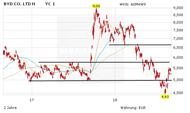 BYD hat starke Ankeraktionäre an Bord. Buffetts Berkshire-Holding hält zehn Prozent, der Elektronikriese Samsung ist mit 1,9 Prozent an Bord. Die Aktie eignet sich für spekulative Anleger. Um 5,00 Euro ist eine Position vertretbar.