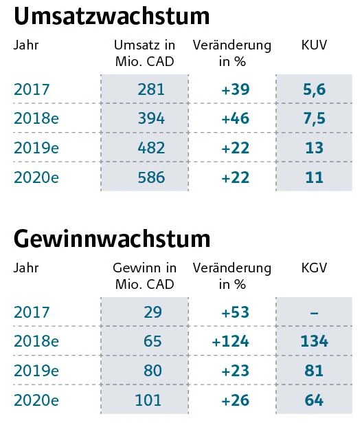 Es waren die Zahlen zum vierten Quartal, welche die Aktie explodieren ließen. Der Umsatz stieg um unglaubliche 144 Prozent auf 125 Millionen Kanadische Dollar – weit schneller, als die Analysten mit einem Wachstum von 51 Prozent erwarteten. Für eine weitere Überraschung sorgten die Gewinne je Aktie von 0,07 Dollar. Denn hier rechneten die Experten sogar mit einem Verlust von 0,09 Dollar.